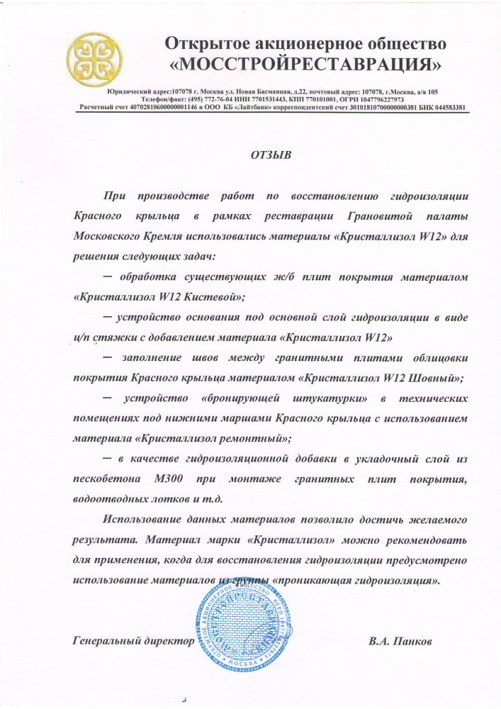Кристаллизол Кистевой - обработка ж/б плит Кристаллизол W12 - добавка в ц/п стяжку для основания Кристаллизол Шовный - заполнение швов между гранитными плитами облицовки покрытия Красного крыльца Отзыв на сайте |