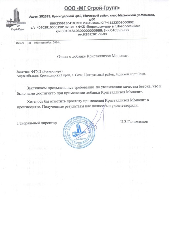 Кристаллизол Монолит - увеличение качества бетона Отзыв на сайте |